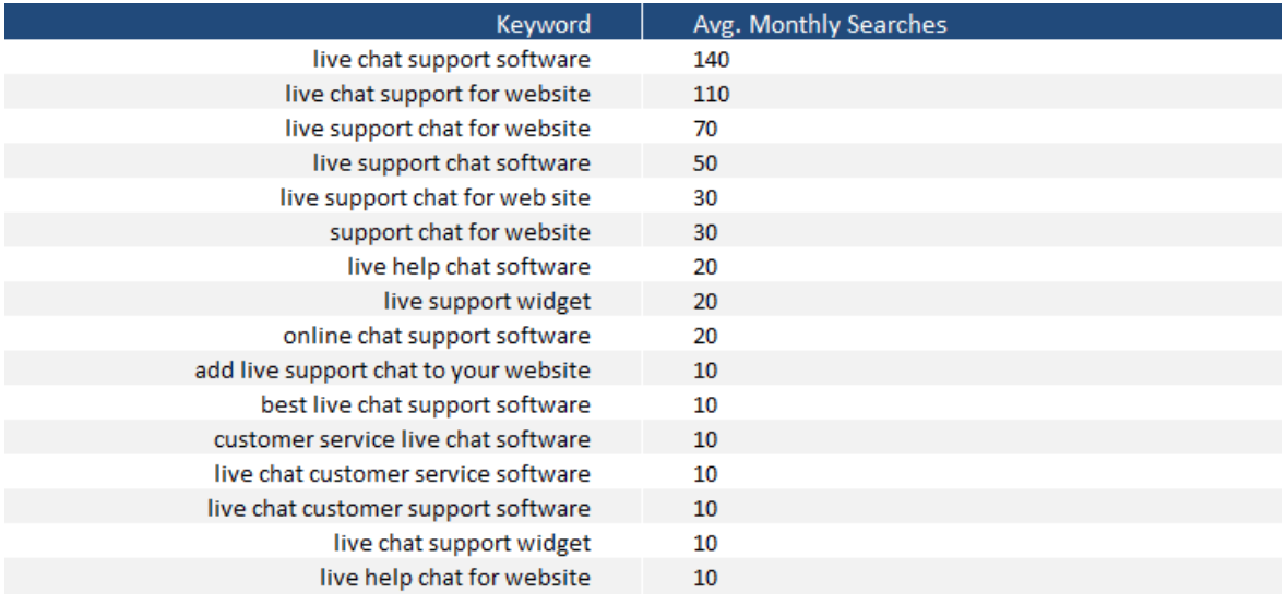 On the other hand, a long-tail keyword phrase, such as “online chat support software” although has just 20 monthly searches, it is much easier to rank.