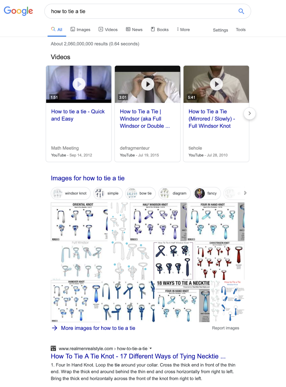 For example, “Sweet Child O’Mine music video” is a video keyword as the searcher — as indicated by her query — is looking for the video itself. Other than such obvious queries, “how-to” keywords also often trigger videos in the SERPs, e.g., “how to tie a tie.”